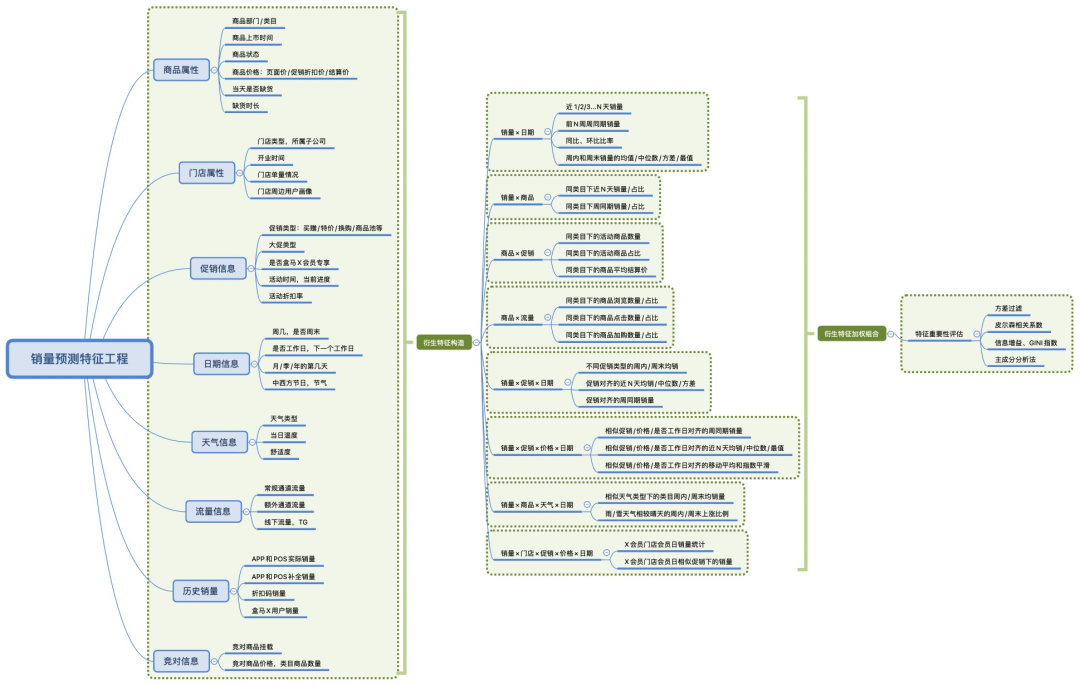 特征工程在销量预测中,特别是在基于传统机器学习的建模方法中是比较关键的一个步骤。这部分往往需要结合数据的内在规律和业务场景的经验进行处理。目前盒马预测使用的基础特征包括商品属性、门店属性、促销信息、日期信息、天气信息、流量信息、历史销量和竞对信息八大类。