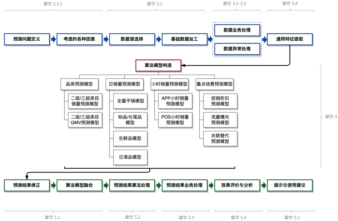 销量预测的整体技术路线可以分成以下14个步骤,其中前半部分是对问题的分析定义,以及数据的各种预处理,目的是将建模过程中的类似工作进行统一收口,保证数据口径的一致性,方便后续模型的开发;中间部分是各种预测模型的构造;后半部分是对模型结果的校验和融合,以及根据业务逻辑进行的后处理,目的是提高预测结果的实用性和灵活性,实现对业务需求的快速响应。具体模块和对应的介绍章节如下:
