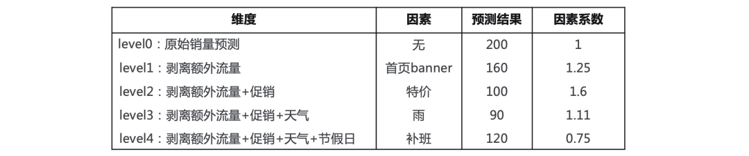为了便于理解和分析,这里仅选择业务重点关心的因素进行展示,而不是罗列出所有特征的重要性。目前选取了促销、流量、天气、假日四种因素。白盒化系数的计算逻辑如下:算法依次在原始销量预测上剥离额外流量、促销、天气、节假日因素,得到剥离各个因素后的预测结果,然后再计算各预测结果的相对系数,从而得到算法对于特定因素的响应幅度。例如下面这个例子中,原始销量预测结果为200,剥离额外流量的预测结果为160,因此流量因素的系数就是1.25,进一步剥离促销因素后的预测结果为100,所以促销因素的系数就是1.6,以此类推可计算出所有因素的影响: