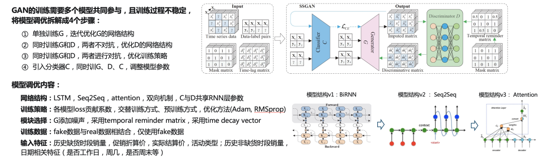 GAN属于无监督学习方法,其在没有label的数据集中也能适用,因此通用性更强。这里采用了SSGAN模型,SSGAN中包含三个角色:生成器的任务是输入包含缺失值的时间序列,输出补全后的完整时序;判别器的任务是判断每个时刻的数据是真实的还是算法生成的;分类器的任务是对原始时序和算法补全的时序进行分类打标,帮助生成器关注于缺失时刻的补全。训练的过程主要是让生成器和判别器进行对抗,最终希望生成器能够产生以假乱真的补全数据。考虑到GAN的训练需要多个模型共同参与,训练过程不稳定,所以将模型调优拆解成了4个步骤,并对网络结构、训练策略、模块选择等进行了优化。从补全效果来看,SSGAN的准确率比GBDT更高,并且将两类模型融合后能进一步提升准确性和稳定性,具体内容如下: