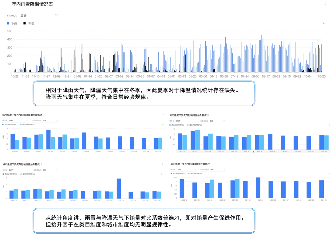 在遇到降雨/降雪,或者是温度突然下降的情况时,盒马的线上销量往往会出现明显增长,为了避免缺货,算法需要提前感知未来的天气情况,并在遇到特殊天气时调整预测结果。从下图的历史数据统计来看,降雨主要集中在夏季的7-9月份,而降温主要集中在11-2月份,并且这类天气对于销量有普遍的促进作用。目前对于天气的响应方案结合了业务的实际处理经验,主要思路是统计每个门店历史相似天气情况下的类目销量增长情况,计算出类目维度的天气系数,然后在后处理阶段作用到销量预测结果上。
