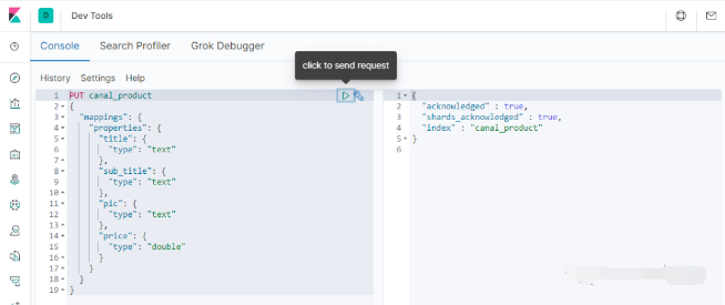 Elasticsearch中创建索引,和MySQL中的product表相对应,直接在Kibana的Dev Tools中使用如下命令创建即可;