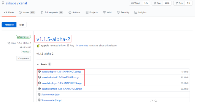 首先我们需要下载canal的各个组件canal-server、canal-adapter、canal-admin,下载地址:https://github.com/alibaba/canal/releases