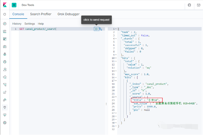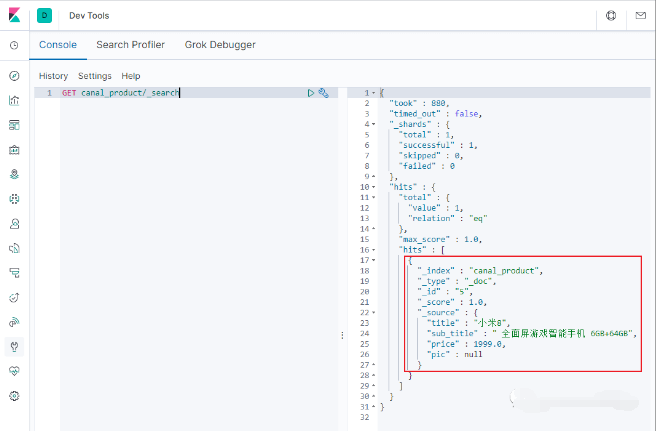 Elasticsearch中搜索下,发现数据已经同步了;