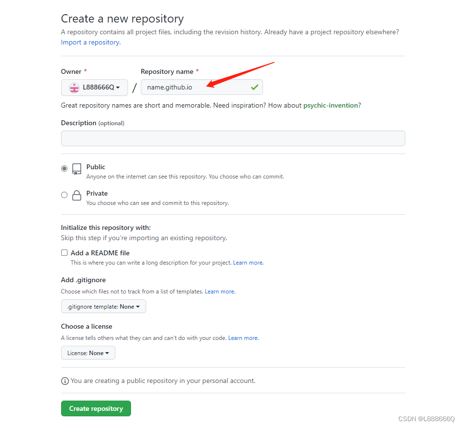 填入新仓库名称必须以 .github.io 结尾,然后点击"Create repository"