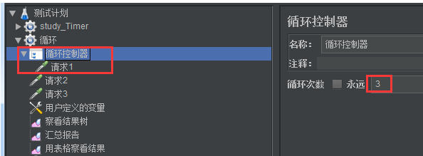 循环控制器,顾名思义就是该控制器下的请求会按设置好的循环次数,循环执行多次。如果同时设置了线程组的循环次数和循环控制器的循环次数,那循环控制器的子节点运行的次数为两个数值相乘的结果。例如:发起3次调用请求,此时执行结果树可以看到一个请求被循环调用了3次。