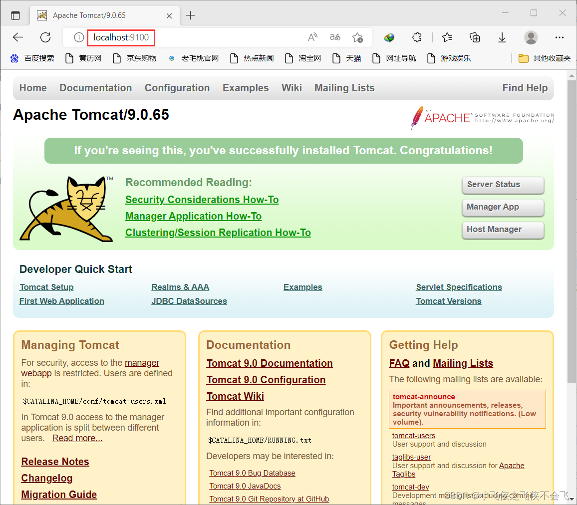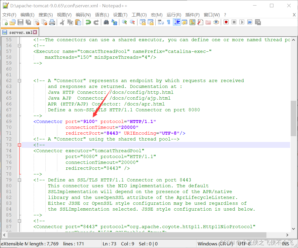 一般在70行左右有port="8080",修改成其他没有占用的端口我改的是"9100",记得保存退出,然后在运行stratup.bat,查看能否运行?