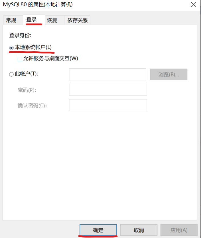 4.双击MySQL8.0-->在窗口上边点击登录界面-->选择本地系统账户-->再点击确定,回到原来的安装界面点击Execute就会出现✔了。