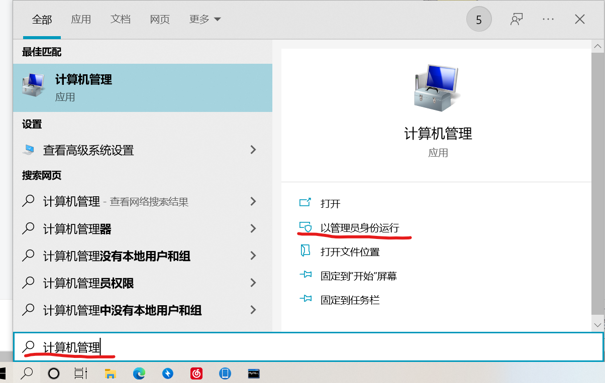 1.点击电脑下方搜索按钮-->搜索:计算机管理-->以管理员身份运行