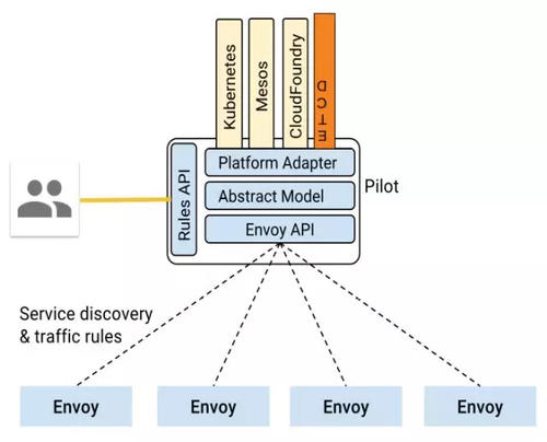 使用Istio的流量管理模型,本质上解耦流量和基础设施扩展,让运维人员通过Pilot指定他们希望流量遵循什么规则,而不是哪些特定的pod/VM应该接收流量 - Pilot和智能Envoy代理搞定其余的。因此,例如,您可以通过Pilot指定您希望特定服务的5%流量可以转到金丝雀版本,而不考虑金丝雀部署的大小,或根据请求的内容将流量发送到特定版本。Pilot负责在Isti服务网格中部署的Envoy实例的生命周期。下图是pilot架构: