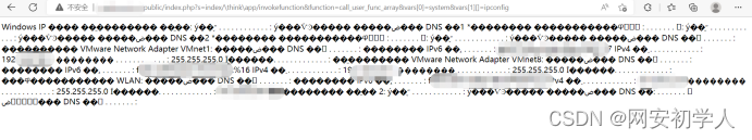 在public目录下执行php请求参数命令(将whoami换成ipconfig观察回显报错,说明命令注入成功)观察到ipconfig后是cmd查看网卡信息是一样的,说明可以通过命令来执行一些操作。