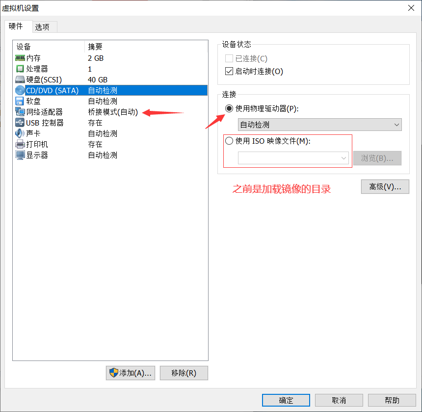 2. 编辑虚拟机设置 -> 硬件 -> CD/DVD(SATA) -> 使用物理驱动器