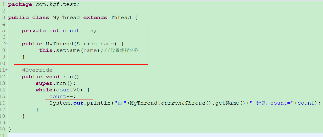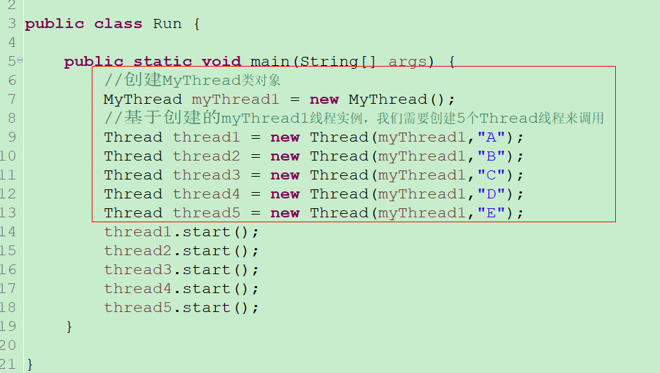 了5个Thread线程来调用MyThread这个线程实例(根据Java实例的特性,new 的一个