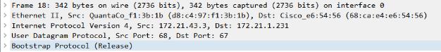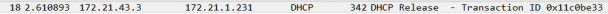 (1)本机IP(172.21.43.3)通过端口68向DHCP的服务器(172.21.1.231)的端口67发包。这个报文将会使DHCP服务器释放发出此报文的客户端的IP地址。当前处在Release阶段。![]()