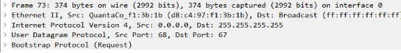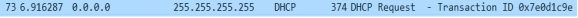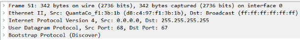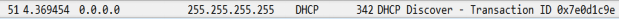 (2)DHCP的客户端以广播的方式向发送Discover请求IP的租用。可以看出此时的IP变成了(0.0.0.0),并且不知道哪个DHCP的服务器会收到。当前处在Discover阶段。![]()