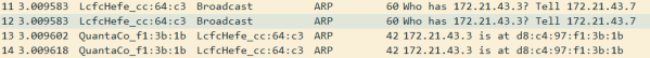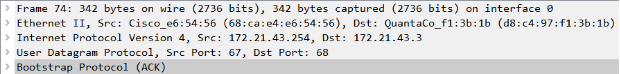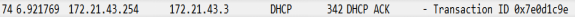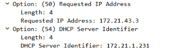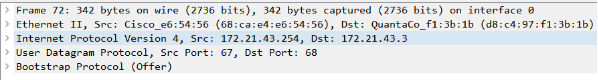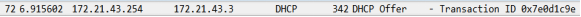 (3)范围内的DHCP Server收到广播消息后,会给client发送Offer报文作为回应。报文中包含Sever准备提供的IP地址(172.21.43.3)和自己的IP地址(172.21.43.254)![]()
