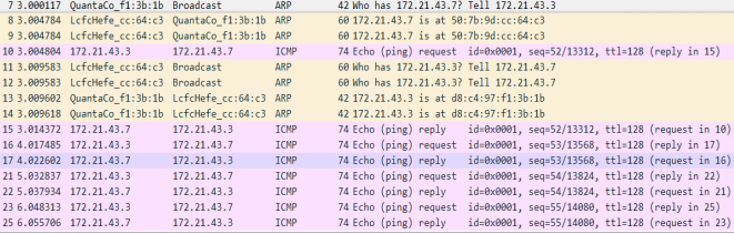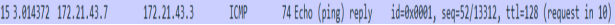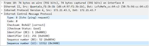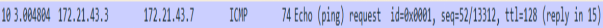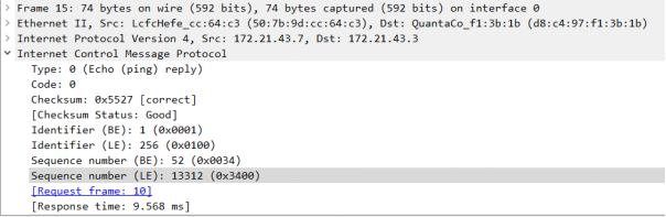 (5)对上面第十条的回显响应。Type的值为8便是回显相应。类型、代码、序列号、标识符和回显请求一致。