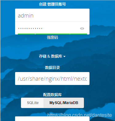 解析上面nginx中配置的域名owncloud.danteit.com,邦定hosts. 访问http://owncloud.danteit.com进行owncloud界面安装.