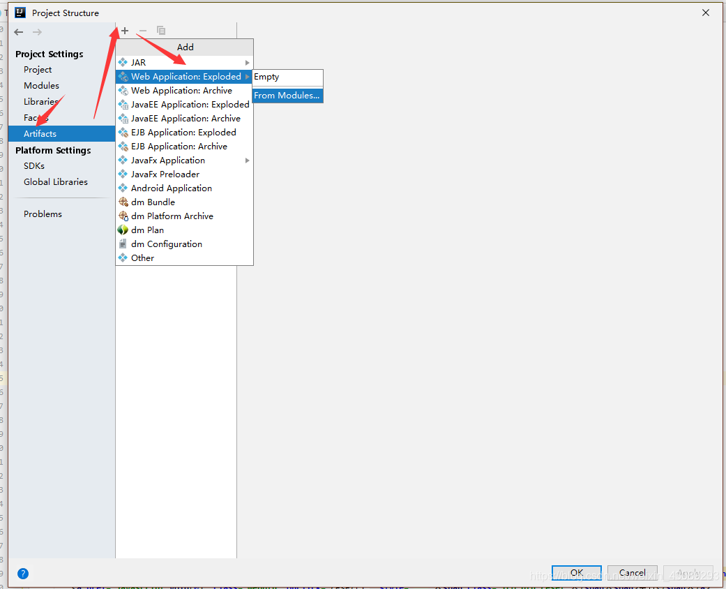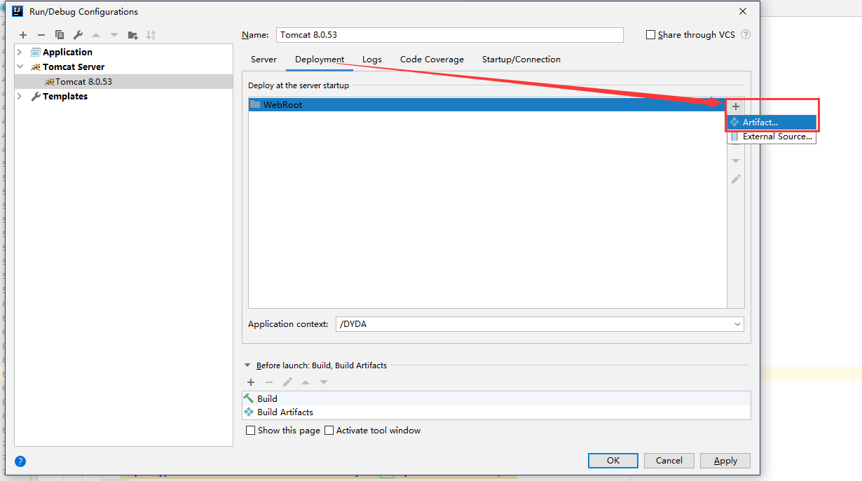 1.2.3回到tomcat配置页面,按下图操作,新增Artifacts