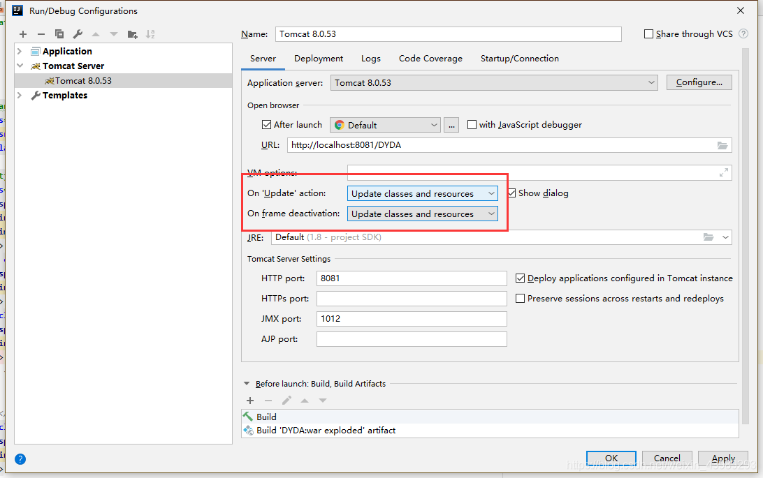 1.2.5 接下来,我们把 On 'Update' action 和On frame deactivation 两个选为 Update classes and resources,