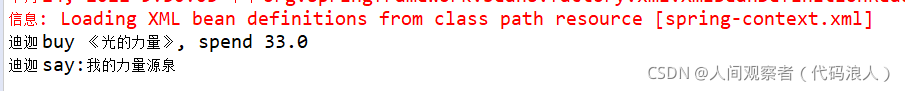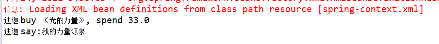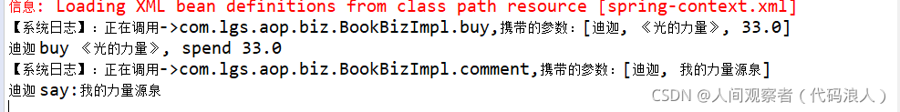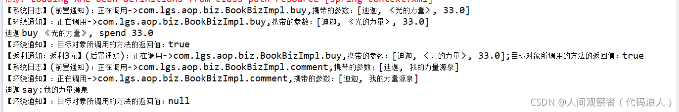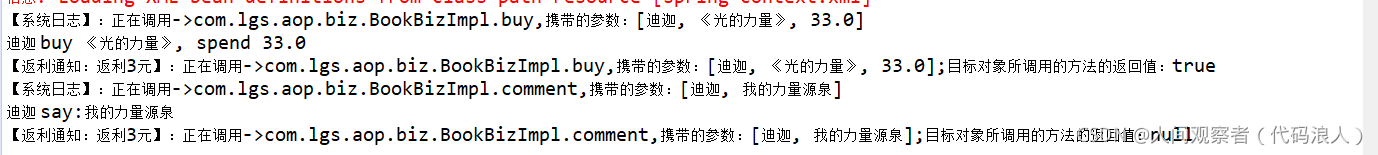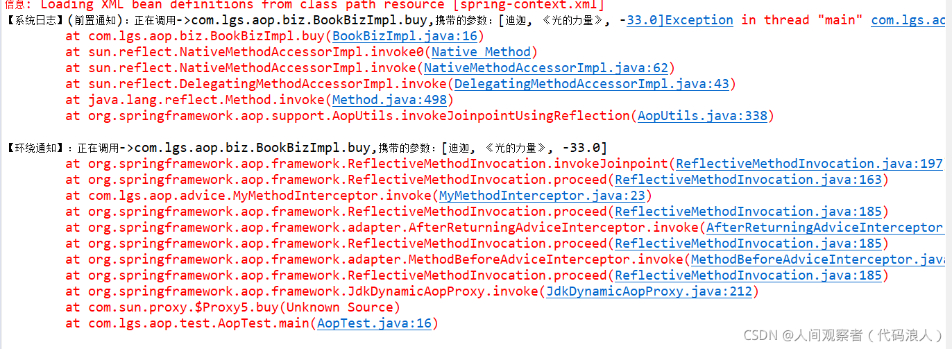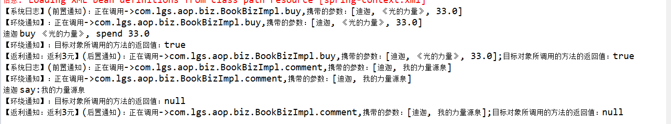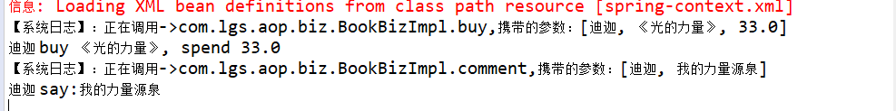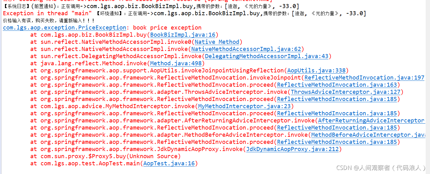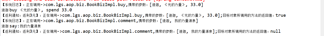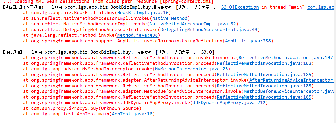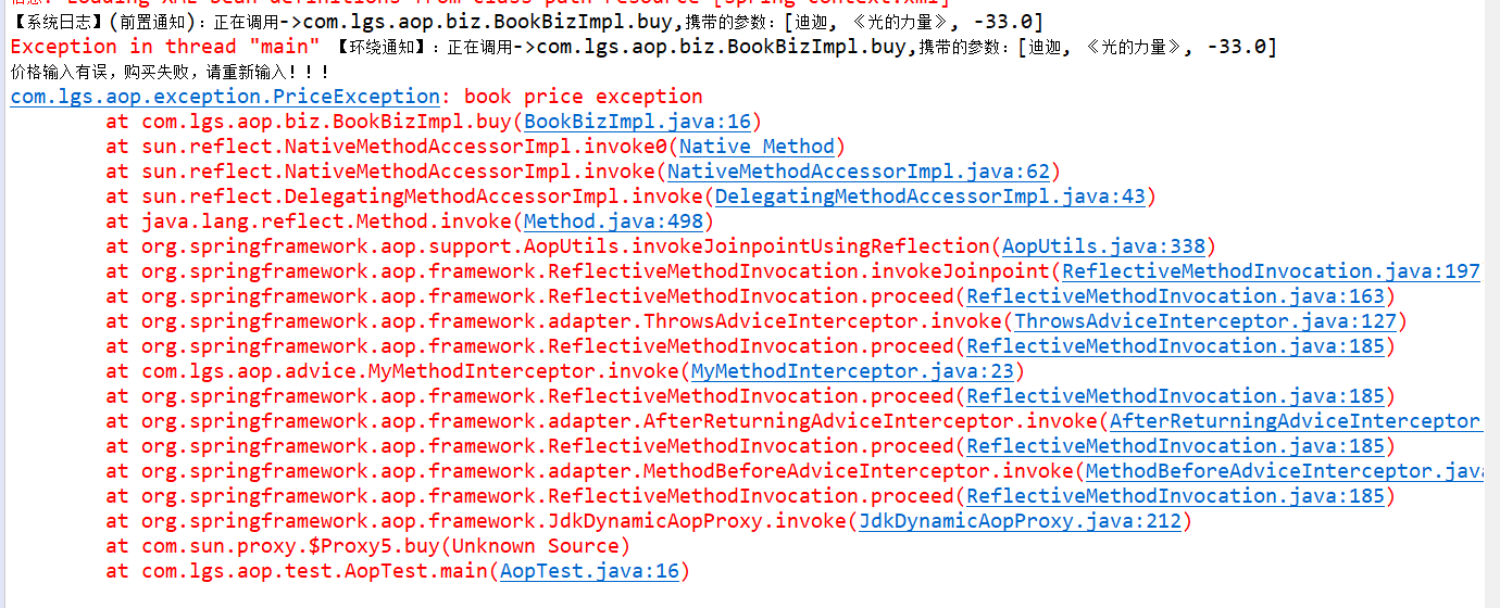 package com.lgs.aop.test; import org.springframework.context.support.ClassPathXmlApplicationContext; import com.lgs.aop.biz.IBookBiz; public class AopTest { public static void main(String[] args) { // 获取到spring-Context.xml配置文件 ClassPathXmlApplicationContext applicationContext = new ClassPathXmlApplicationContext("/spring-context.xml"); // 根据bean的id得到实现类 // IBookBiz bookBiz = (IBookBiz) applicationContext.getBean("bookBiz"); // 调用前置通知 IBookBiz bookBiz = (IBookBiz) applicationContext.getBean("proxyFactoryBean"); // 买书 bookBiz.buy("迪迦", "《光的力量》", -33d); // 评论 // bookBiz.comment("迪迦", "我的力量源泉"); } }运行结果如下(会有提示,出现解决方案)