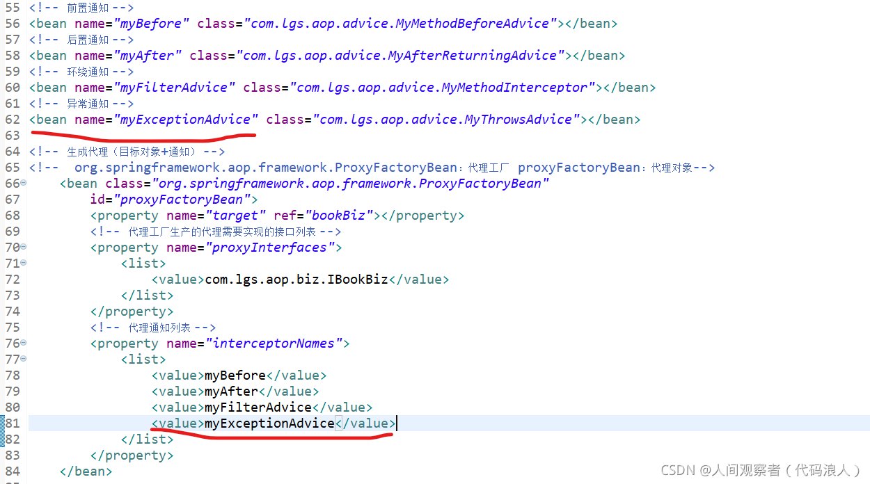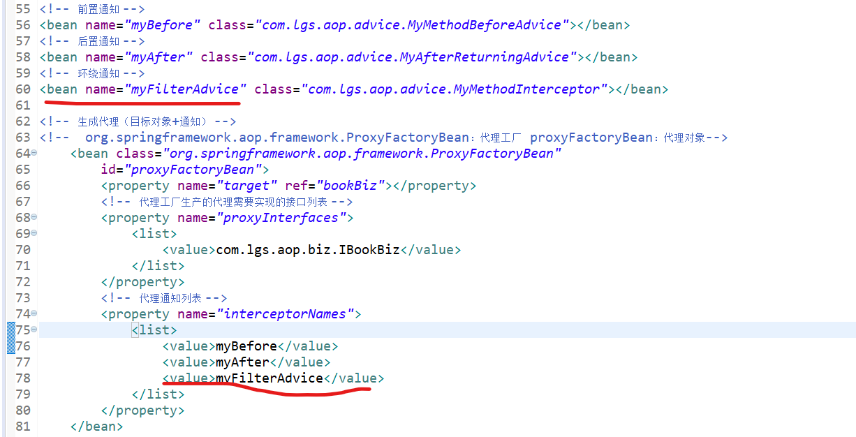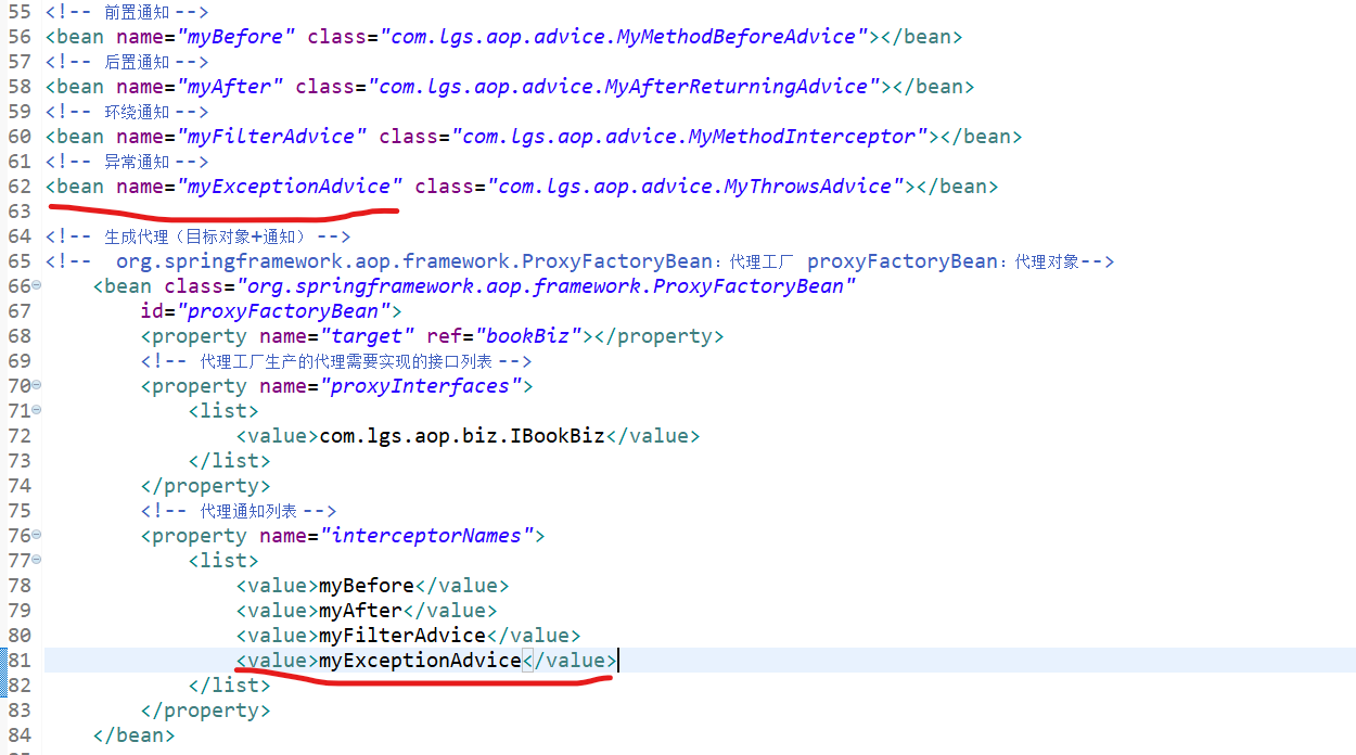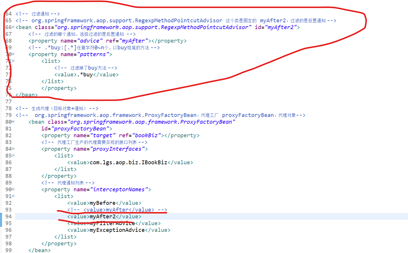 <?xml version="1.0" encoding="UTF-8"?> <beans xmlns="http://www.springframework.org/schema/beans" xmlns:xsi="http://www.w3.org/2001/XMLSchema-instance" xmlns:aop="http://www.springframework.org/schema/aop" xmlns:context="http://www.springframework.org/schema/context" xsi:schemaLocation="http://www.springframework.org/schema/beans http://www.springframework.org/schema/beans/spring-beans.xsd http://www.springframework.org/schema/aop http://www.springframework.org/schema/aop/spring-aop-4.3.xsd http://www.springframework.org/schema/context http://www.springframework.org/schema/context/spring-context-4.3.xsd"> <!-- 本文件中配置整个项目中包含的所有的JavaBean,目的在于spring项目的统一管理 --> <!-- <bean name="userBiz1" class="com.lgs.ioc.biz.impl.UserBizImpl1"></bean> --> <bean name="userBiz2" class="com.lgs.ioc.biz.impl.UserBizImpl1"></bean> <bean name="userBiz1" class="com.lgs.ioc.biz.impl.UserBizImpl2"></bean> <bean name="personAction" class="com.lgs.ioc.web.PersonAction"> <property name="userBiz" ref="userBiz2"></property> </bean> <bean name="userAction1" class="com.lgs.ioc.web.UserAction1"> <property name="userBiz" ref="userBiz1"></property> </bean> <bean name="userAction2" class="com.lgs.ioc.web.UserAction2"> <property name="userBiz" ref="userBiz1"></property> </bean> <bean name="userAction3" class="com.lgs.ioc.web.UserAction3"> <property name="userBiz" ref="userBiz1"></property> </bean> <bean name="paramAction" class="com.lgs.ioc.web.ParamAction"> <!-- <property name="name" value="鲁迅"></property> <property name="age" value="34"></property> <property name="hobby"> <list> <value>学医</value> <value>白话文学</value> <value>作家</value> </list> </property> --> <constructor-arg name="name" value="武则天"></constructor-arg> <constructor-arg name="age" value="22"></constructor-arg> <constructor-arg name="hobby"> <list> <value>跳舞</value> <value>唱歌</value> <value>当皇帝</value> </list> </constructor-arg> </bean> <!-- aop --> <!-- 目标 --> <bean name="bookBiz" class="com.lgs.aop.biz.BookBizImpl"></bean> <!-- 前置通知 --> <bean name="myBefore" class="com.lgs.aop.advice.MyMethodBeforeAdvice"></bean> <!-- 后置通知 --> <bean name="myAfter" class="com.lgs.aop.advice.MyAfterReturningAdvice"></bean> <!-- 环绕通知 --> <bean name="myFilterAdvice" class="com.lgs.aop.advice.MyMethodInterceptor"></bean> <!-- 异常通知 --> <bean name="myExceptionAdvice" class="com.lgs.aop.advice.MyThrowsAdvice"></bean> <!-- 过滤通知 --> <!-- org.springframework.aop.support.RegexpMethodPointcutAdvisor 这个类是固定的 myAfter2:过滤的是后置通知 --> <bean class="org.springframework.aop.support.RegexpMethodPointcutAdvisor" id="myAfter2"> <!-- 过滤的哪个通知,选择过滤的是后置通知 --> <property name="advice" ref="myAfter"></property> <!-- .*buy:[.*]任意字符0~n个,以buy结尾的方法 --> <property name="patterns"> <list> <!-- 过滤掉了buy方法 --> <value>.*buy</value> </list> </property> </bean> <!-- 生成代理(目标对象+通知) --> <!-- org.springframework.aop.framework.ProxyFactoryBean:代理工厂 proxyFactoryBean:代理对象--> <bean class="org.springframework.aop.framework.ProxyFactoryBean" id="proxyFactoryBean"> <property name="target" ref="bookBiz"></property> <!-- 代理工厂生产的代理需要实现的接口列表 --> <property name="proxyInterfaces"> <list> <value>com.lgs.aop.biz.IBookBiz</value> </list> </property> <!-- 代理通知列表 --> <property name="interceptorNames"> <list> <value>myBefore</value> <!-- <value>myAfter</value> --> <value>myAfter2</value> <value>myFilterAdvice</value> <value>myExceptionAdvice</value> </list> </property> </bean> </beans>测试类AopTest.java:(几个通知案例测试类基本相同,有变动我会截图展示出来的)