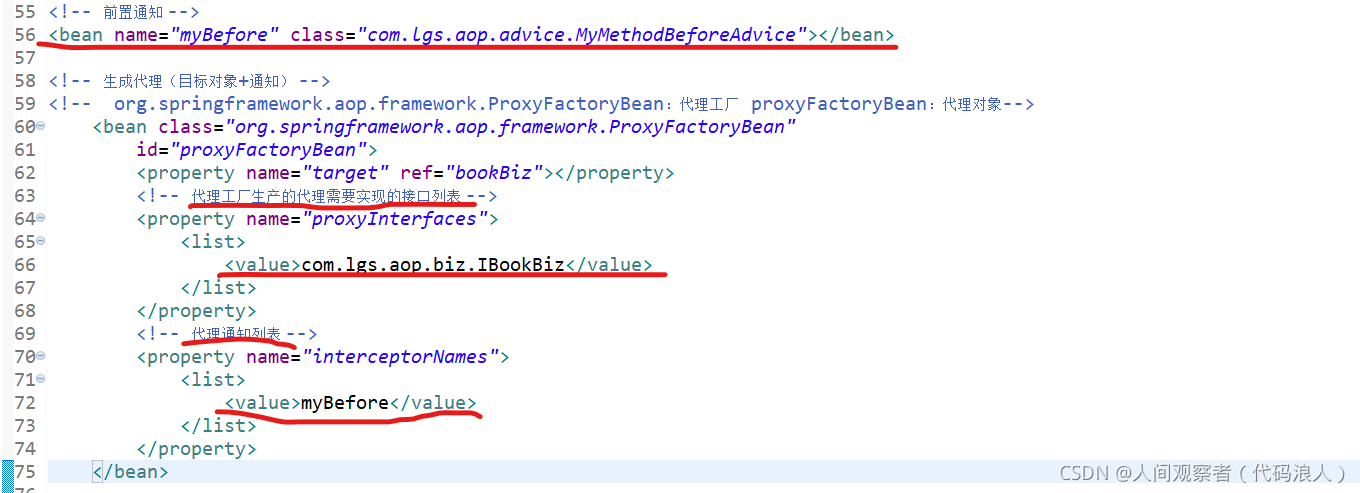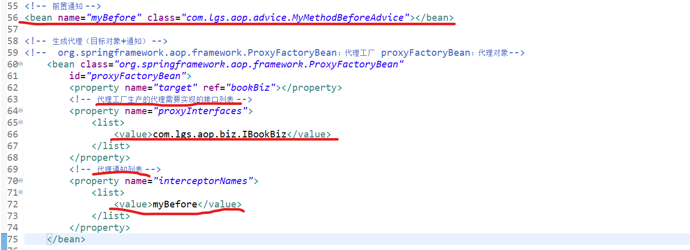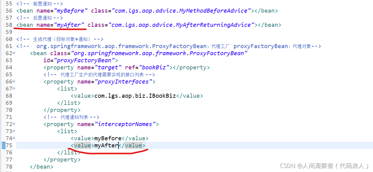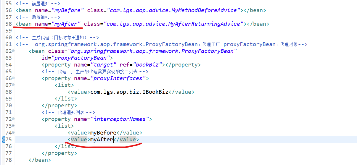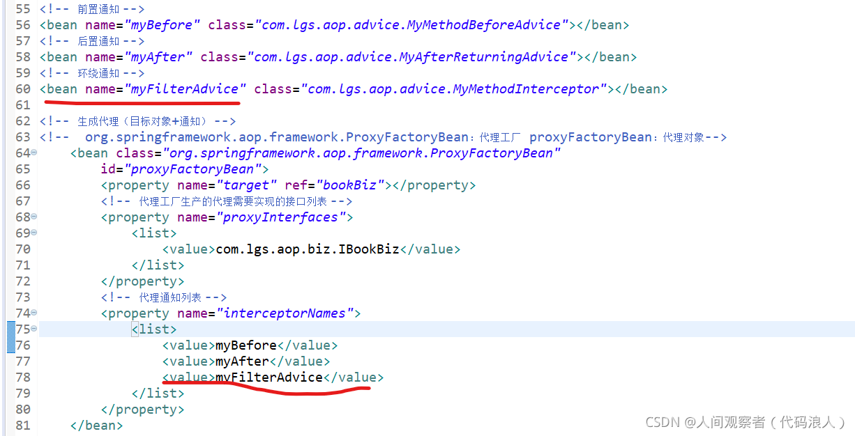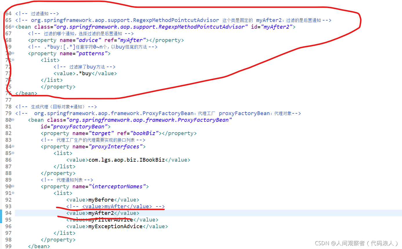 <?xml version="1.0" encoding="UTF-8"?> <beans xmlns="http://www.springframework.org/schema/beans" xmlns:xsi="http://www.w3.org/2001/XMLSchema-instance" xmlns:aop="http://www.springframework.org/schema/aop" xmlns:context="http://www.springframework.org/schema/context" xsi:schemaLocation="http://www.springframework.org/schema/beans http://www.springframework.org/schema/beans/spring-beans.xsd http://www.springframework.org/schema/aop http://www.springframework.org/schema/aop/spring-aop-4.3.xsd http://www.springframework.org/schema/context http://www.springframework.org/schema/context/spring-context-4.3.xsd"> <!-- 本文件中配置整个项目中包含的所有的JavaBean,目的在于spring项目的统一管理 --> <!-- <bean name="userBiz1" class="com.lgs.ioc.biz.impl.UserBizImpl1"></bean> --> <bean name="userBiz2" class="com.lgs.ioc.biz.impl.UserBizImpl1"></bean> <bean name="userBiz1" class="com.lgs.ioc.biz.impl.UserBizImpl2"></bean> <bean name="personAction" class="com.lgs.ioc.web.PersonAction"> <property name="userBiz" ref="userBiz2"></property> </bean> <bean name="userAction1" class="com.lgs.ioc.web.UserAction1"> <property name="userBiz" ref="userBiz1"></property> </bean> <bean name="userAction2" class="com.lgs.ioc.web.UserAction2"> <property name="userBiz" ref="userBiz1"></property> </bean> <bean name="userAction3" class="com.lgs.ioc.web.UserAction3"> <property name="userBiz" ref="userBiz1"></property> </bean> <bean name="paramAction" class="com.lgs.ioc.web.ParamAction"> <!-- <property name="name" value="鲁迅"></property> <property name="age" value="34"></property> <property name="hobby"> <list> <value>学医</value> <value>白话文学</value> <value>作家</value> </list> </property> --> <constructor-arg name="name" value="武则天"></constructor-arg> <constructor-arg name="age" value="22"></constructor-arg> <constructor-arg name="hobby"> <list> <value>跳舞</value> <value>唱歌</value> <value>当皇帝</value> </list> </constructor-arg> </bean> <!-- aop --> <!-- 目标 --> <bean name="bookBiz" class="com.lgs.aop.biz.BookBizImpl"></bean> <!-- 前置通知 --> <bean name="myBefore" class="com.lgs.aop.advice.MyMethodBeforeAdvice"></bean> <!-- 后置通知 --> <bean name="myAfter" class="com.lgs.aop.advice.MyAfterReturningAdvice"></bean> <!-- 环绕通知 --> <bean name="myFilterAdvice" class="com.lgs.aop.advice.MyMethodInterceptor"></bean> <!-- 异常通知 --> <bean name="myExceptionAdvice" class="com.lgs.aop.advice.MyThrowsAdvice"></bean> <!-- 过滤通知 --> <!-- org.springframework.aop.support.RegexpMethodPointcutAdvisor 这个类是固定的 myAfter2:过滤的是后置通知 --> <bean class="org.springframework.aop.support.RegexpMethodPointcutAdvisor" id="myAfter2"> <!-- 过滤的哪个通知,选择过滤的是后置通知 --> <property name="advice" ref="myAfter"></property> <!-- .*buy:[.*]任意字符0~n个,以buy结尾的方法 --> <property name="patterns"> <list> <!-- 过滤掉了buy方法 --> <value>.*buy</value> </list> </property> </bean> <!-- 生成代理(目标对象+通知) --> <!-- org.springframework.aop.framework.ProxyFactoryBean:代理工厂 proxyFactoryBean:代理对象--> <bean class="org.springframework.aop.framework.ProxyFactoryBean" id="proxyFactoryBean"> <property name="target" ref="bookBiz"></property> <!-- 代理工厂生产的代理需要实现的接口列表 --> <property name="proxyInterfaces"> <list> <value>com.lgs.aop.biz.IBookBiz</value> </list> </property> <!-- 代理通知列表 --> <property name="interceptorNames"> <list> <value>myBefore</value> <!-- <value>myAfter</value> --> <value>myAfter2</value> <value>myFilterAdvice</value> <value>myExceptionAdvice</value> </list> </property> </bean> </beans>测试类AopTest.java:(几个通知案例测试类基本相同,有变动我会截图展示出来的)