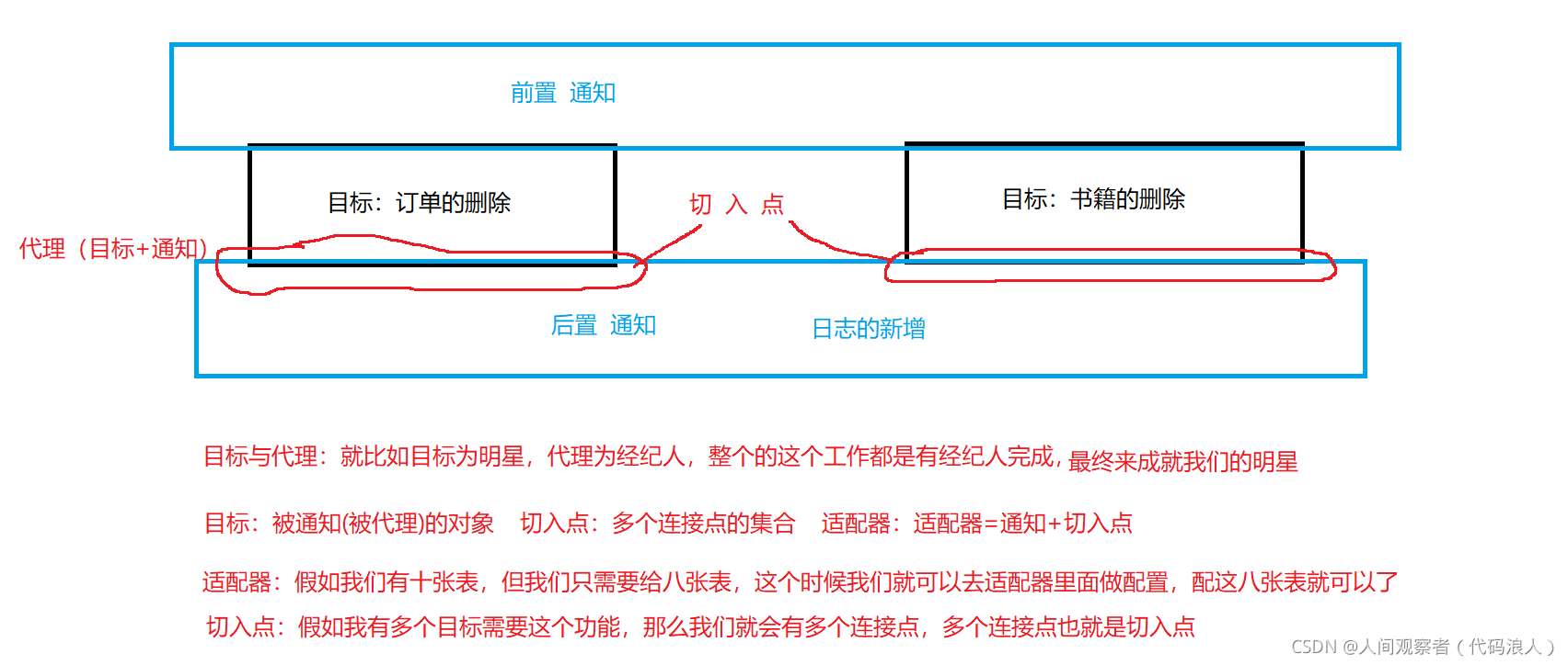 注1:完成具体的业务逻辑通知(Advice):在某个特定的连接点上执行的动作,同时Advice也是程序代码的具体实现,例如一个实现日志记录的代码(通知有些书上也称为处理)