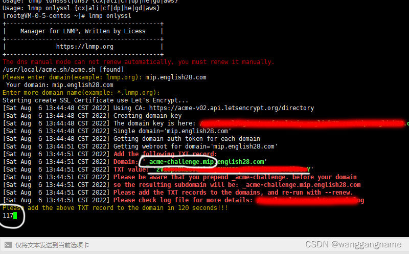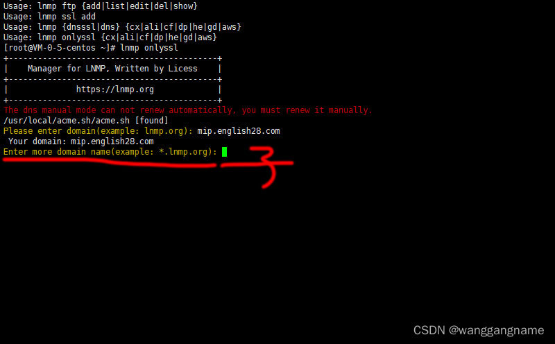 4、此时界面,会出现如:Enter more domain name(example: *.lnmp.org):________;此时如果您还需要申请该域名的其它子域名,可以继续填写域名,如果只是申请上面那一个域名的SSL,直接回车即可。