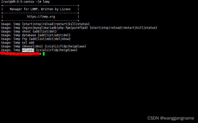 2、先使用lnmp指令,可查询出lnmp本身有包括数据库、nginx网站配置、https、ftp等操作权限。