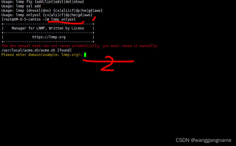 在上图中所标识2的位置,输入要申请SSL证书的网站域名,接着回车键;例如如下的完整代码: