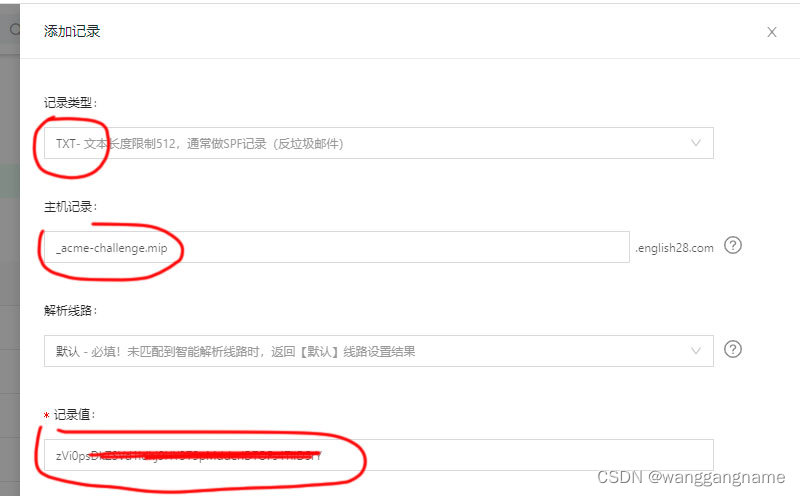 上图中,系统提示需要添加一条TXT 解析,如白色的标注;