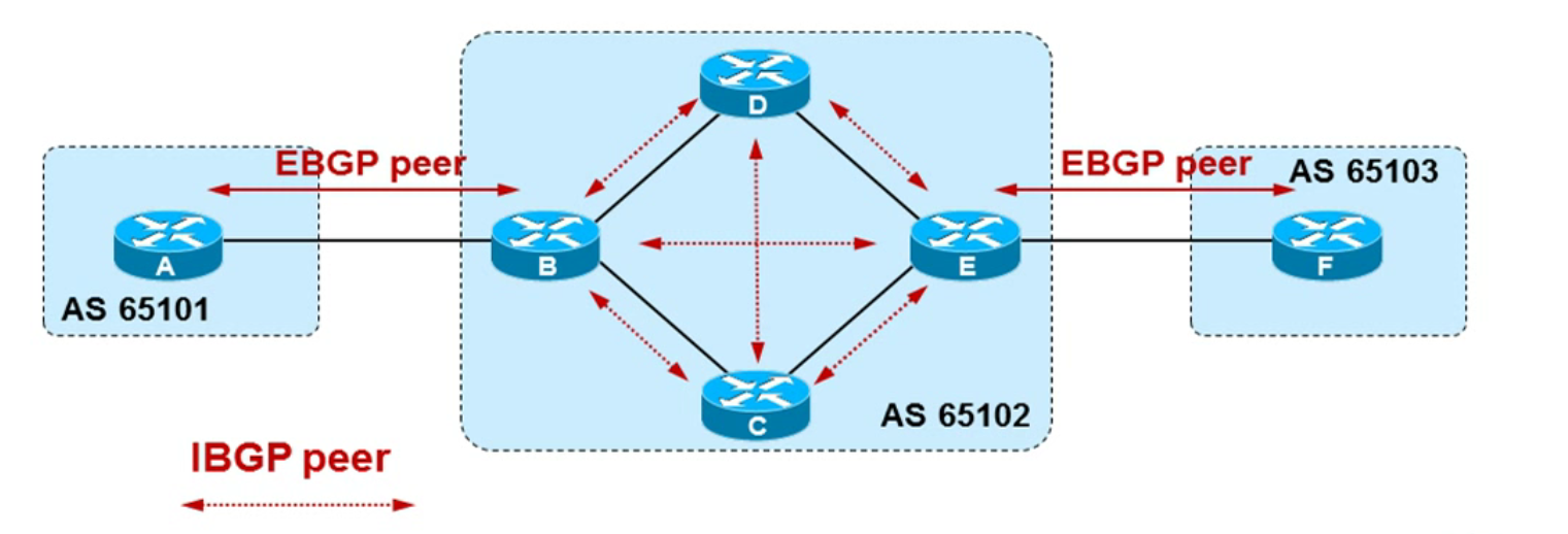1:通过图可知,A 与 B 之间的 Peer 为 EBGP,B 与 E 之间为 Peer IBGP,E 与 F 之间为 Peer EBGP 邻接