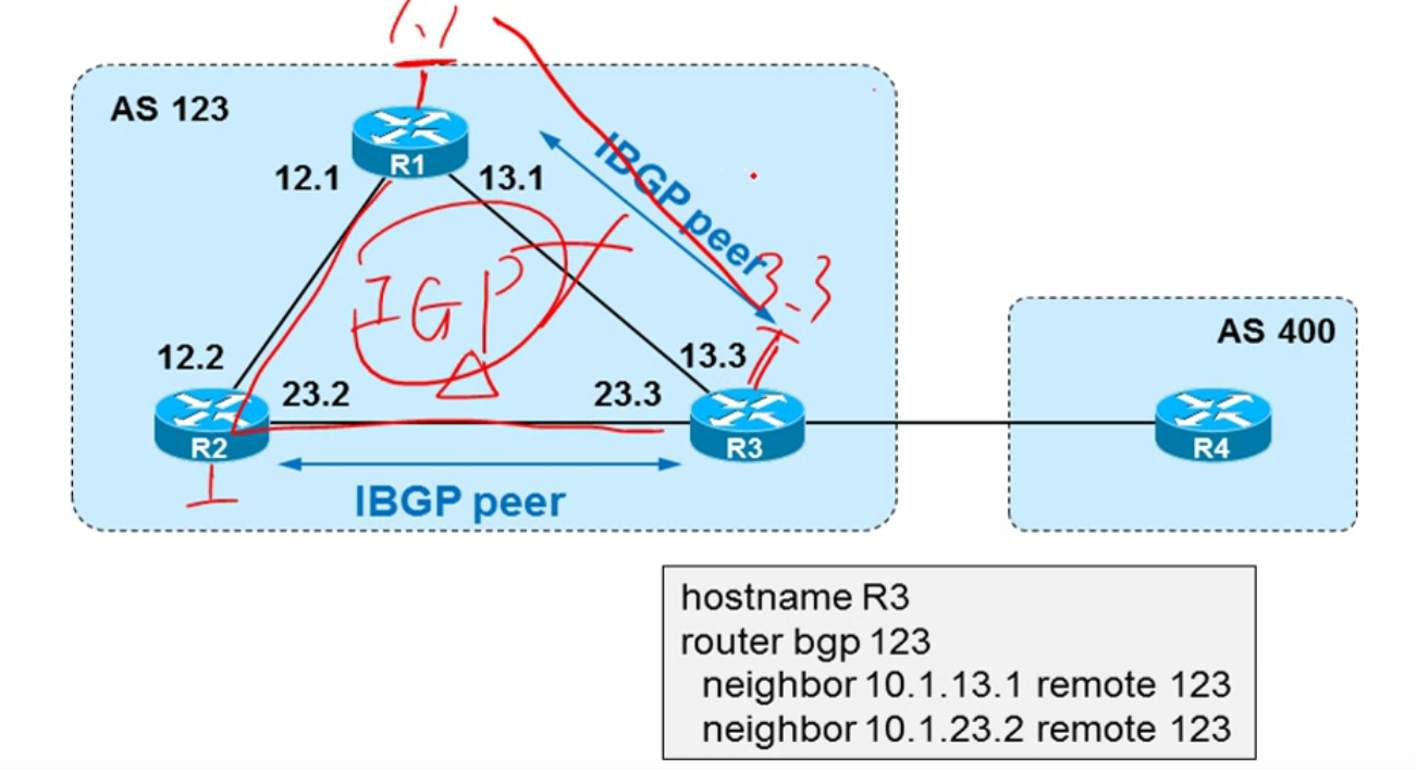 由于水分分割原则的存在,BGP 要求 AS 内,需保证 IBGP 全互联 ( neighbor 命令指定)。