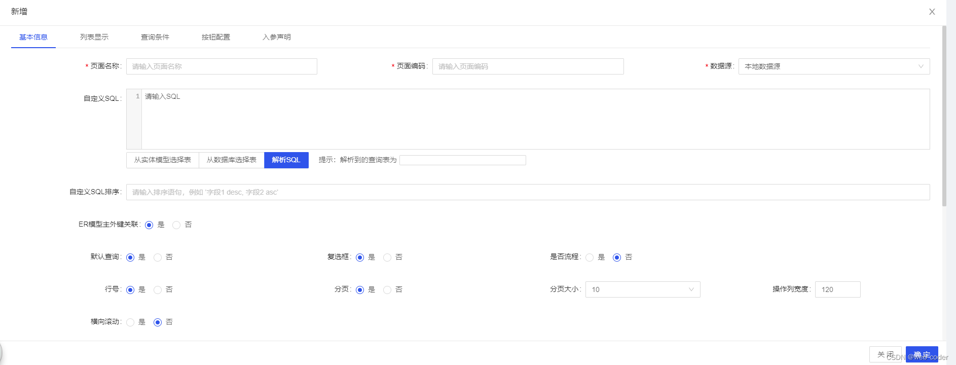 在表格中填写页面名称、编码等信息,可以自己定义Sql也可以从实体模型或数据库中选择表生成自动生成查询sql,点击解析sql会在列表显示标签中自动填充显示的字段及字段名称,还可以配置sql排序字段,以及列表中的横向滚动条的宽度等信息。