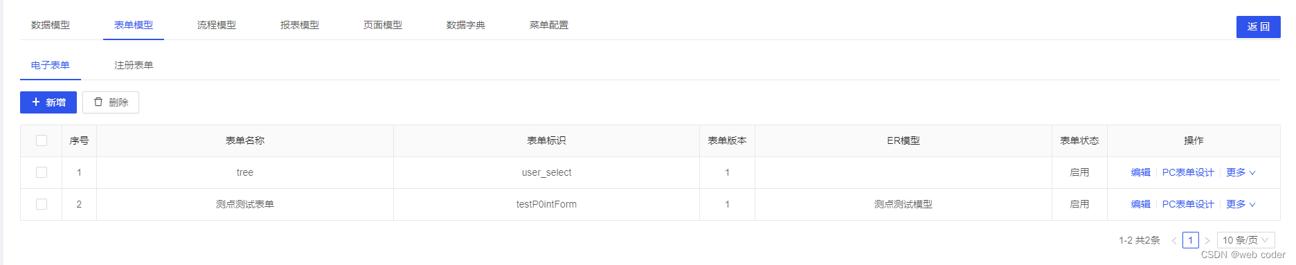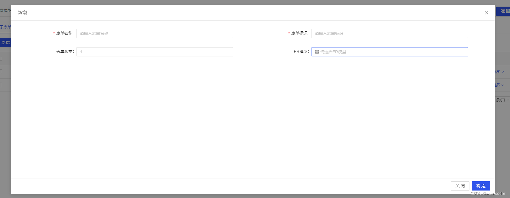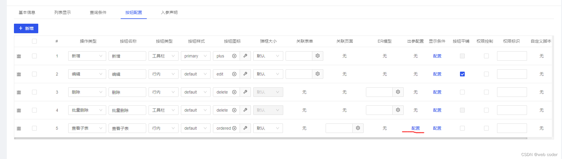 可在该菜单中设置列表顶部或者行中按钮。注意配置ER模型或表单。