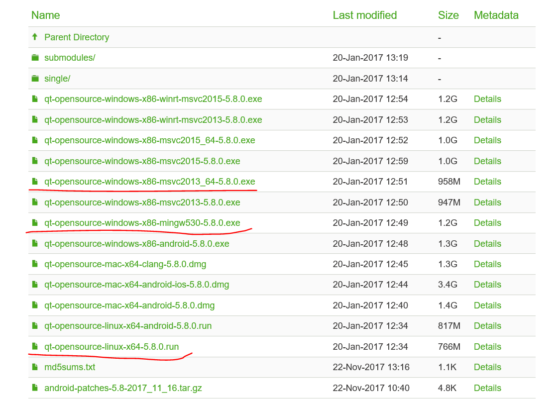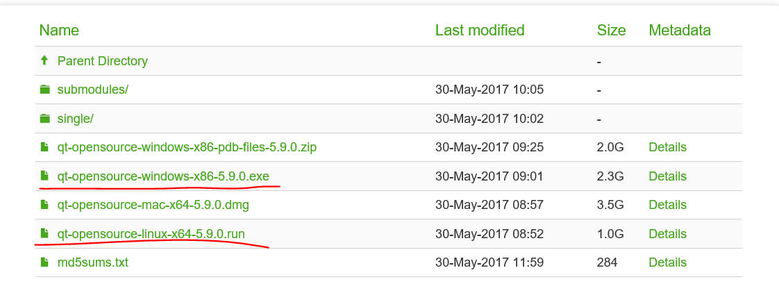 3、这里面就是所有的各个版本的qt了,包括早期的Qt4,选择自己需要的就行,这儿主要是Qt5,并且以qt5.9为分界线,会有一点不一样。这儿分别选择qt5.8和qt5.9,进去之后再分别选择qt5.8.0和qt5.9.0(中间位是版本号,最后一位是补丁号)。