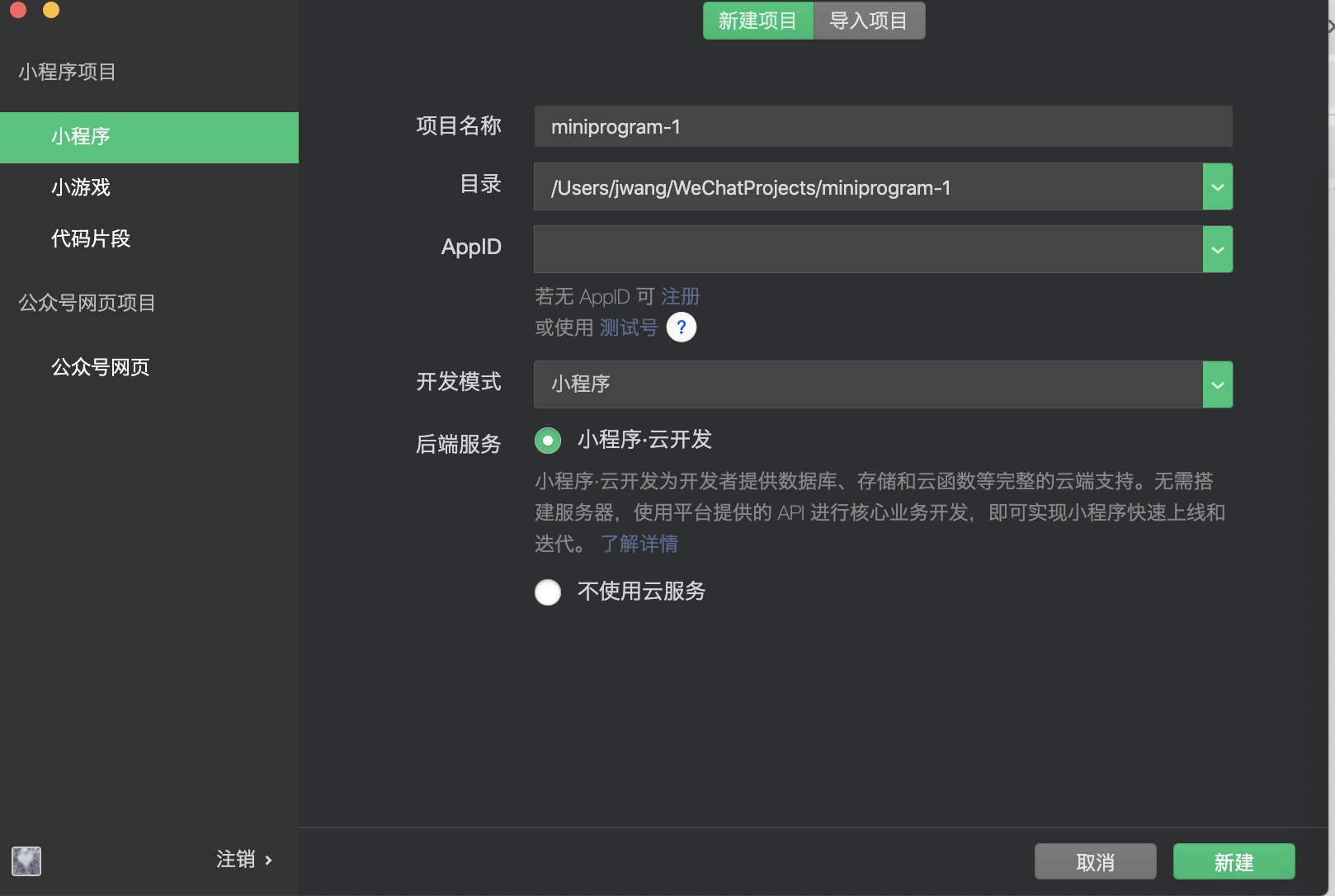新建小程序项目,将AppID填写进去,不使用云服务(只是测试,如果需要再详细解决)