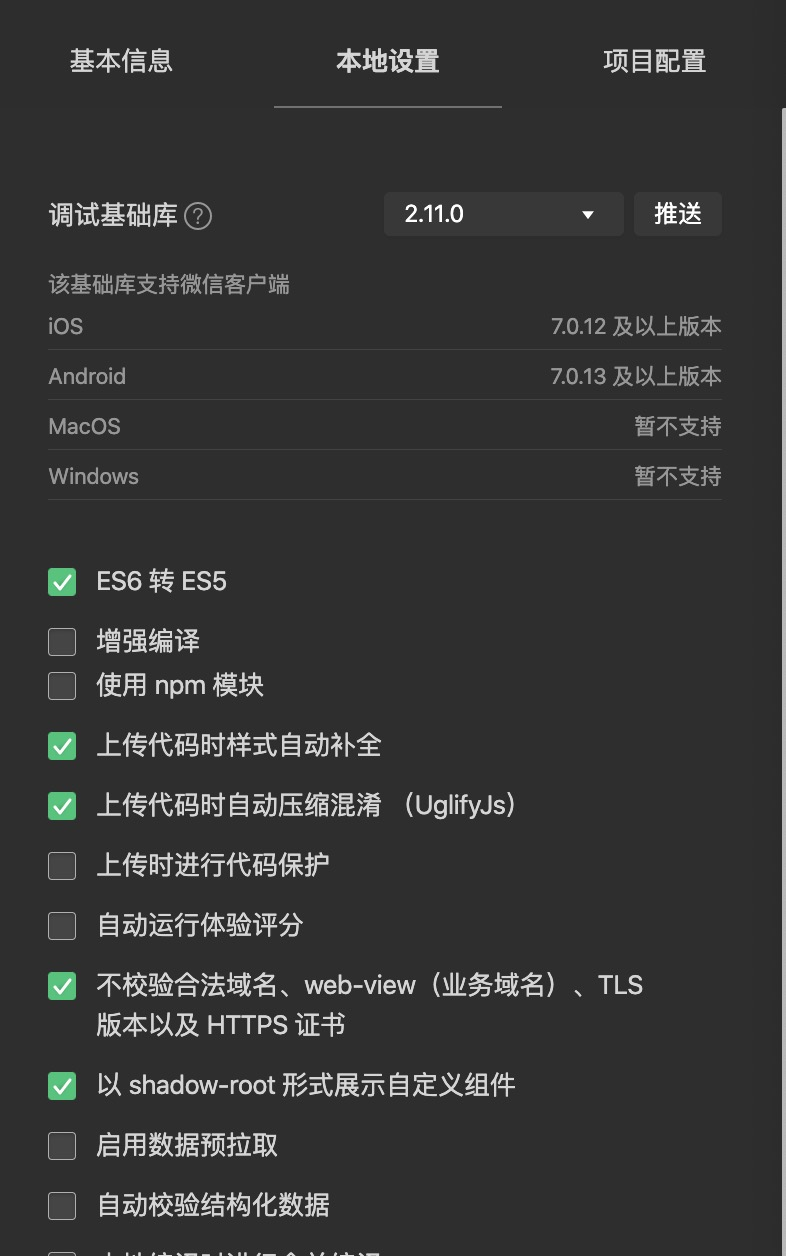 - 若没有,可以在微信开发者工具中选择设置-项目设置-勾选-不校验合法域名,建立本地开发对接Django后台进行操作