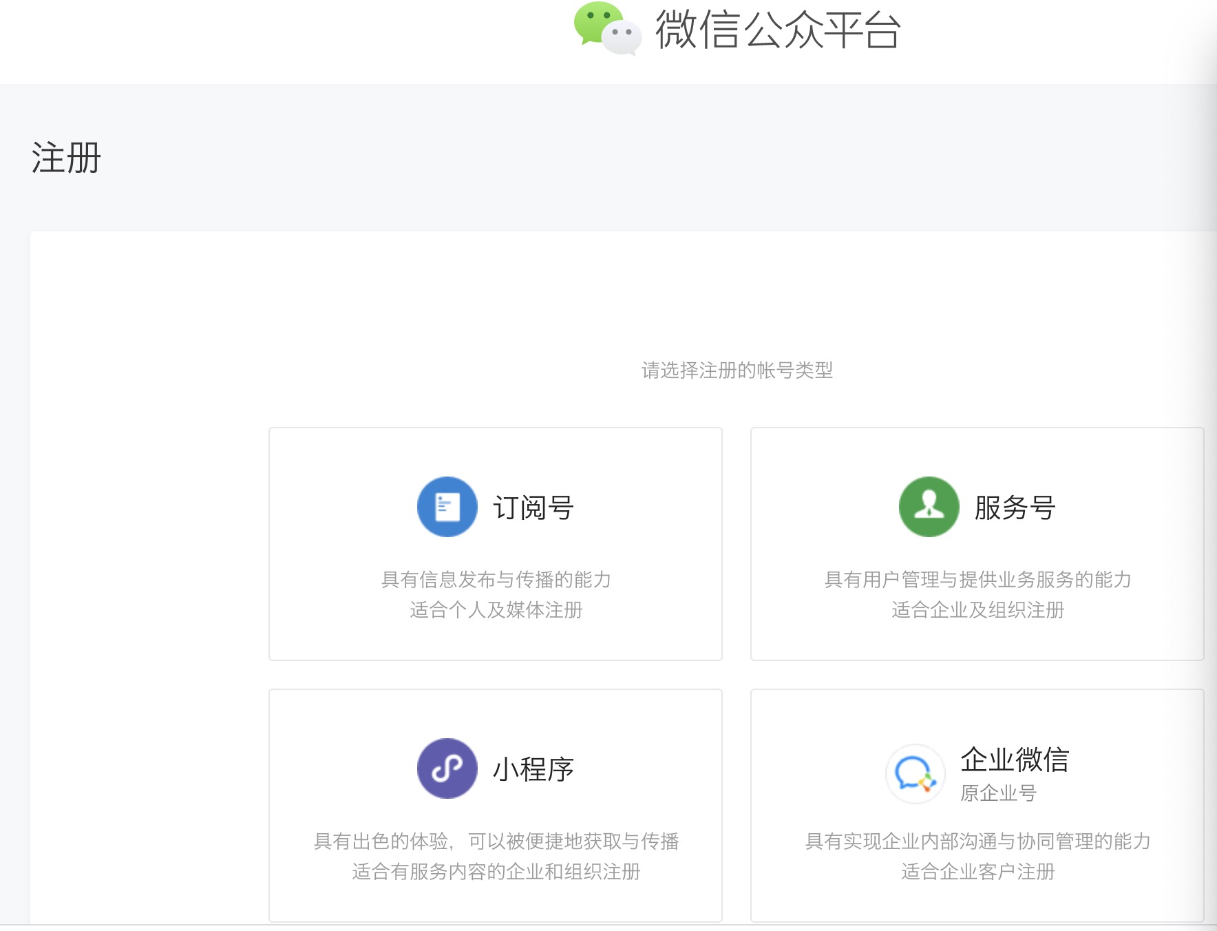 - 在微信公众平台注册选择小程序,按照提示进行注册