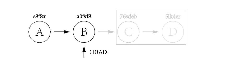 其中:A 和 B 是正常提交,而 C 和 D 是错误提交。现在,我们想把 C 和 D 回退掉。而此时,HEAD 指针指向 D 提交(5lk4er)。我们只需将 HEAD 指针移动到 B 提交(a0fvf8),就可以达到目的。
