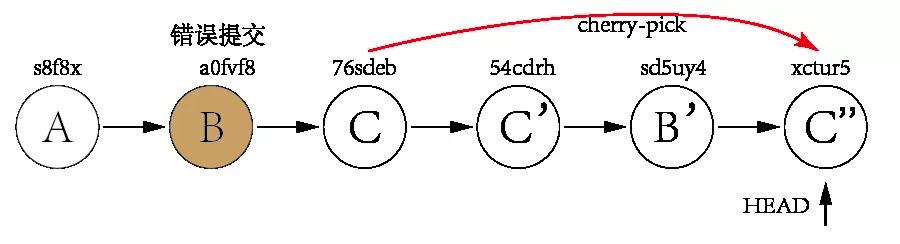 这时,直接使用 git reset 命令将 HEAD 指针重置到 A 提交显然是不行的,因为 C 提交是正确的,需要保留的。先把 C 提交 及 B 提交全部回退,再使用 cherry-pick 命令将 C 提交重新再生成一个新的提交 C'',这样就实现了将 B提交回退的需求。完整的过程如下: