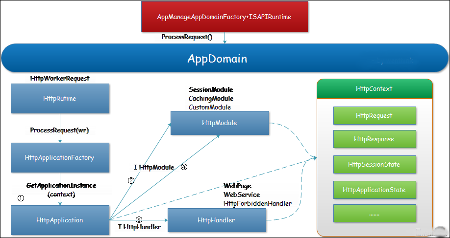 - IsapiRuntime.ProcessRequest() called by non-managed code 非托管代码调用IsapiRuntime.ProcessRequest()方法
