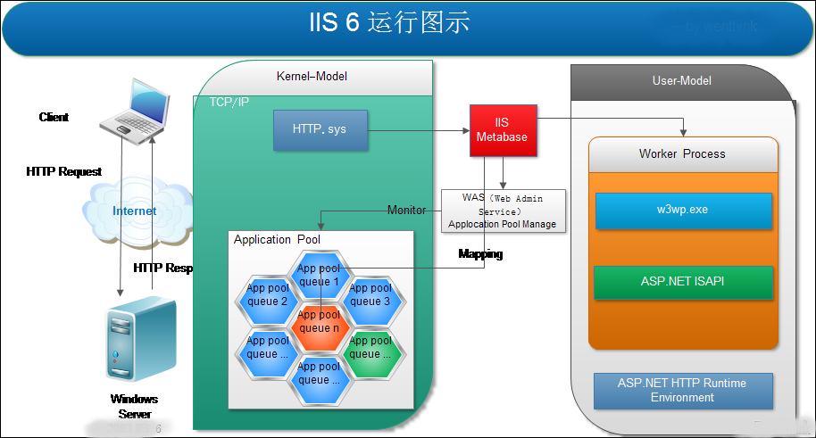 尽管IIS6的应用程序池是单独的EXE,但是它们对HTTP操作进行了高度的优化,它们直接和内核模式下的HTTP.SYS驱动程序进行通讯.收到的请求被直接路由给适当的应用程序池.InetInfo基本上只是一个管理程序和一个配置服务程序-大部分的交互实际上是直接在HTTP.SYS和应用程序池之间发生,所有这些使IIS6成为了比IIS5更加的稳定和高效的环境.特别对静态内容和ASP.NET程序来说这是千真万确的