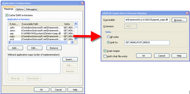 You can interactively see these mapping in the IIS Service manager as shown in Figure 1. Look at the root of the Web Site and the Home Directory tab, then Configuration | Mappings