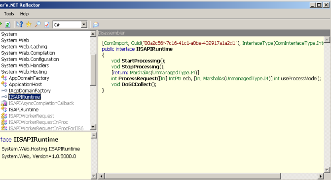 Figure 3 shows the interface and call signatures for the IISAPIRuntime interface as shown in Lutz Roeder’s excellent .NET Reflector tool (.NET Decompiler: Decompile Any .NET Code | .NET Reflector). Reflector an assembly viewer and disassembler that makes it very easy to look at medadata and disassembled code (in IL, C#, VB) as shown in Figure 3. It’s a great way to explore the bootstrapping process.