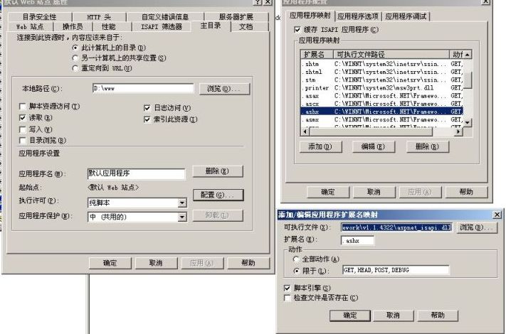 你可以在IIS服务管理器里看到这些映射,如图1所示。打开Web站点的根目录的属性,选择主目录选项卡,然后查看 配置|应用程序映射。
