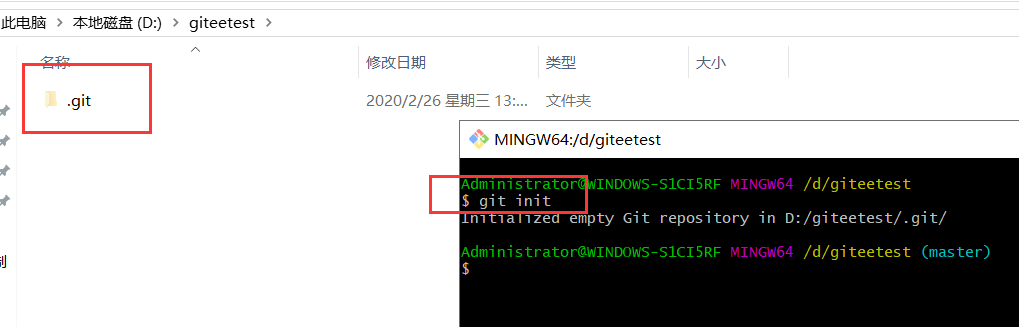 然后输入git init 进行初始化,然后文件夹中会出现一个.git的隐藏文件夹