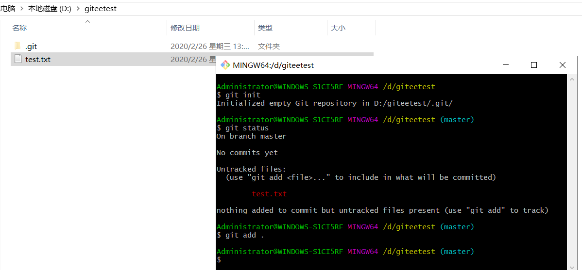 3.git add . 所有文件写入缓存区,这个“ . ”的位置不能和add挨着,要有一个空格,不然会报错