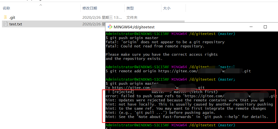 发现又报错了,这里大概是说第一次提交,码云仓库里有其他代码,这里的策略是要么直接全部覆盖(暴力型方案),要么先同步码云里的代码
